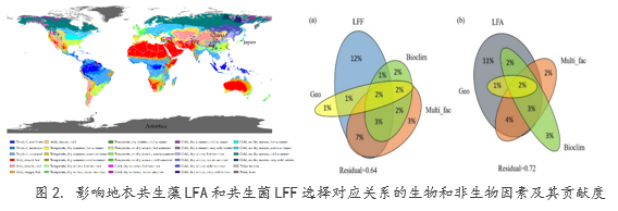 基于来自森林和荒漠生态系统四种气候带的共球藻共生地衣8目14科28属41种,对可能影响其共生的生物和非生物因素进行了研究。结果显示:参与共生的共球藻物种多样性被大大低估,研究涉及的共球藻物种62%为未被描述的新物种;共生菌和共生藻物种是影响共生关系的最大因素(图2);温带地区的菌藻共生关系更专一,而干旱地区菌藻选择对应的嵌套值最低,暗示干旱地区菌藻共生专一性强;地衣菌藻之间的共生关系非随机产生,共生藻“loss”和“failure to diverge”事件对菌藻共生影响最大。