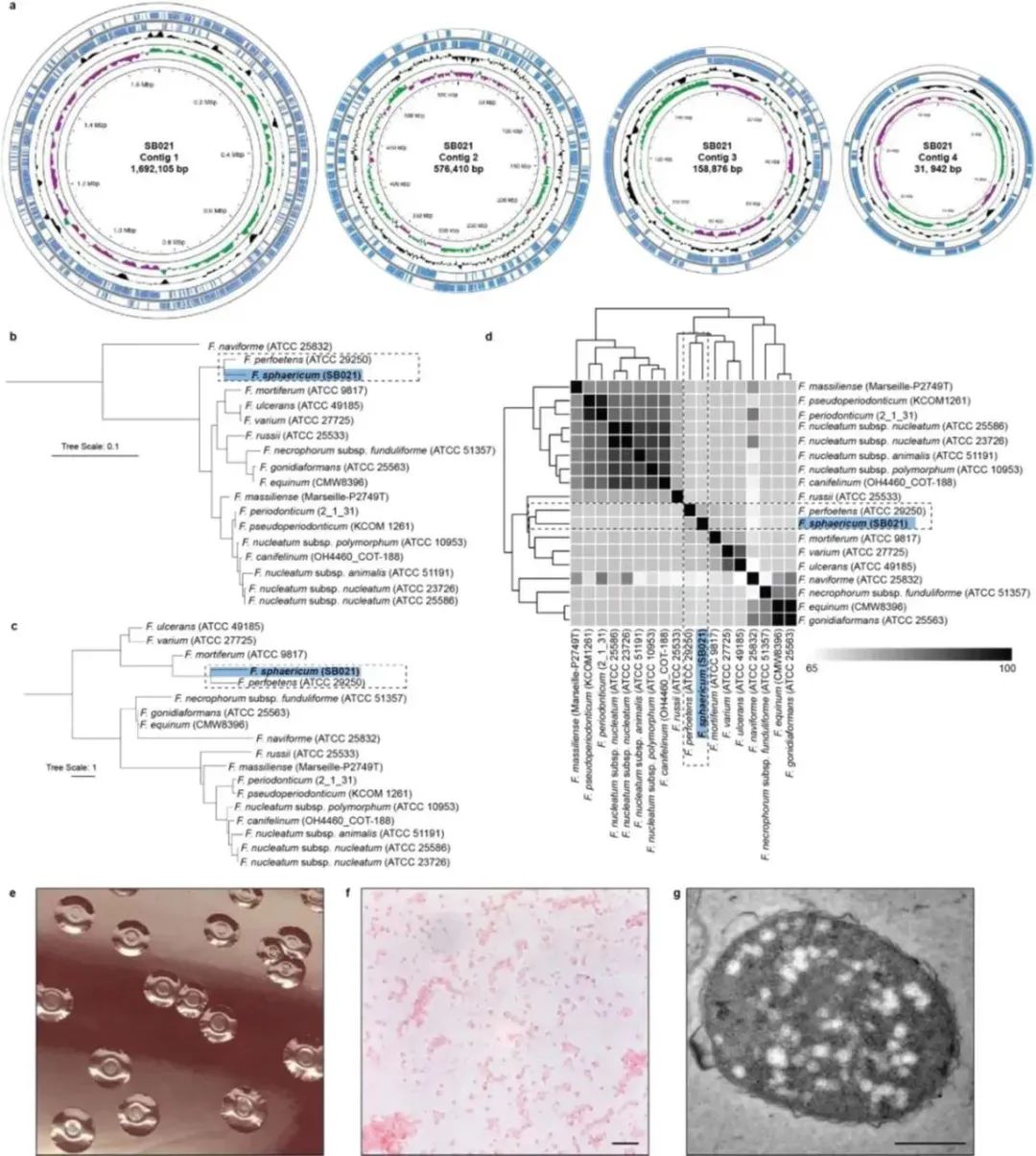 癌组织是一个在很大程度上未开发的微生物生态位,它为特定细菌群落的定植和生长提供了独特的环境,并提供了识别新细菌物种的机会。在这里,研究人员报告了一种从原发性结肠癌组织中分离出来的新型梭杆菌种F. sphaericum sp. nov.(Fs)的独特特征。研究人员基于 PacBio SMRT测序获得了该生物体的完整、封闭的基因组,由两条假定的染色体和两个额外的染色体外元件组成(图1a),并在系统发育上确认其分类为梭杆菌属(图1b-d)。Fs的表型和基因组分析表明,这种新型生物体呈球状(图1e),在梭杆菌成员中很少见,并且具有不同的基因组结构和基因含量。