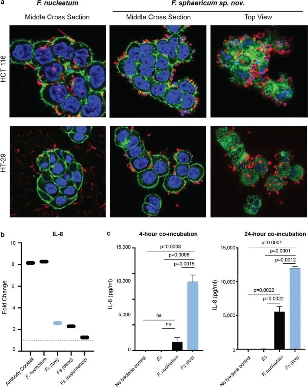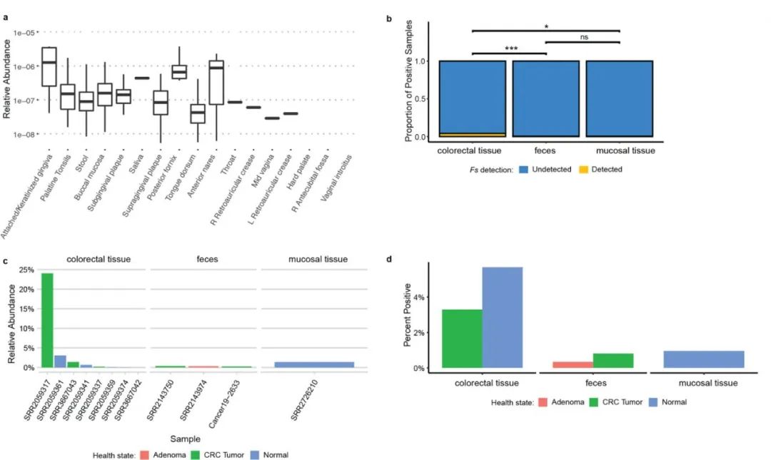 Fs显示出与其他梭杆菌属一致的代谢谱和抗生素耐药性。在体外,Fs具有贴壁和免疫调节能力,因为它与人结肠癌上皮细胞密切相关并促进IL-8分泌(图2a-b)。对~1,750个人类宏基因组样本中Fs的流行率和丰度的分析表明,它是人类口腔和粪便中普遍存在的低丰度的成员(图3a)。有趣的是,对来自结直肠癌患者的约1,270个标本的分析表明,与粘膜或粪便相比,Fs在结肠和肿瘤组织中显着富集(图3b-c)。