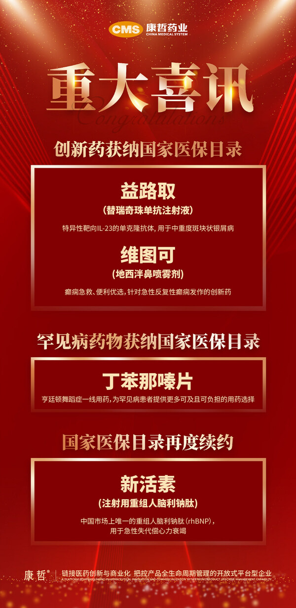 深圳2023年12月13日 /美通社/ -- 康哲药业欣然宣布,根据中国国家医疗保障局及国家人力资源和社会保障部于2023年12月13日发布的通知,创新药地西泮鼻喷雾剂(维图可)及替瑞奇珠单抗注射液(益路取)、罕见病用药丁苯那嗪片新纳入中国《国家基本医疗保险、工伤保险和生育保险药品目录(2023年)》("国家医保目录")乙类范围,注射用重组人脑利钠肽(新活素)继续纳入国家医保目录乙类范围,并将自2024年1月1日起正式实施。此外,2023年3月获批的创新药甲氨蝶呤注射液-银屑病适应症(美泰彤)已纳入国家医保目录甲类范围。