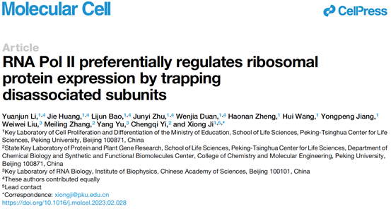 2023年3月15日,北京大学生命科学学院、北大-清华生命科学联合中心季雄课题组在Molecular Cell杂志在线发表了题为“RNA Pol II preferentially regulates ribosomal protein expression by trapping disassociated subunits”的研究论文。该研究报道了RNA聚合酶亚基RPB3能够通过CBC-PCF11和小延伸复合物特异性调控核糖体蛋白基因的3’末端加工的非经典兼职功能机制,表明RNA聚合酶可以通过游离组分实现单功能酶到多功能酶的转变,把不同的活性限制在全酶附近增加了基因表达效率,并且实现特异性调控。同时该研究提出的SDDS系统为其它复合体亚基的非经典兼职功能研究提供了新工具。该工作被Molecular Cell杂志在同期“Meet the authors”专栏作为研究亮点采访报道。