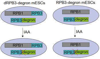 研究者首先利用染色质组分的分子筛实验在多种哺乳动物细胞系中均检测到独立于Pol II全酶的RPB3,称为disassociated RPB3(dRPB3)。随后研究者设计了一种巧妙的策略-Specific Degradation of Dissociated Subunits,简称SDDS系统,该系统在RPB3 degron细胞的基础上,将偶联linker区的RPB3整合到内源RPB1的终止密码子前,得到纯合的RPB1-linker-RPB3融合蛋白表达细胞,称为dRPB3 degron细胞。理论上RPB3 degron细胞在化学分子吲哚乙酸(IAA)处理后可降解细胞内全部RPB3,而dRPB3 degron细胞在IAA处理后,全酶中的RPB3可被RPB1偶联的RPB3替代,维持了全酶的完整性,但会导致游离于全酶之外的RPB3被降解。因此通过比较dRPB3 degron细胞IAA处理前后的功能差异,即可阐释游离RPB3的功能。
