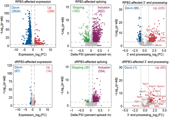 随后,研究者们开展了dRPB3、RPB3降解前后的RNA-seq、ChAR-seq实验分析,结果显示不同于RPB3降解后造成的部分基因表达下调,dRPB3的降解对基因表达幅度影响较小,但却可导致特异的RNA剪接错误和3’末端加工障碍,表明dRPB3参与转录后调控。更有意思的是RNA 3’末端加工障碍特异性富集在核糖体蛋白基因。代表新生转录组的TT-seq实验进一步证明dRPB3参与调控核糖体蛋白基因的RNA 3’末端加工。