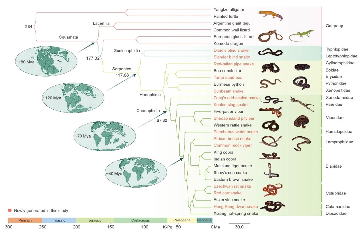 该研究表明蛇类起源于约1.18亿年前早白垩纪,与帝王蛇蜥和科摩多巨蜥组成的支系互为姐妹枝,这提示蛇类的祖先起源于蜥蜴类物种。蛇类最先分化出的类群为盲蛇类物种(Typhlopidae 和 Leptotyphlopidae),在白垩纪-早第三纪分界点(K-Pg, 约6500万年前)的生物大灭绝事件之后迎来了物种的爆发。