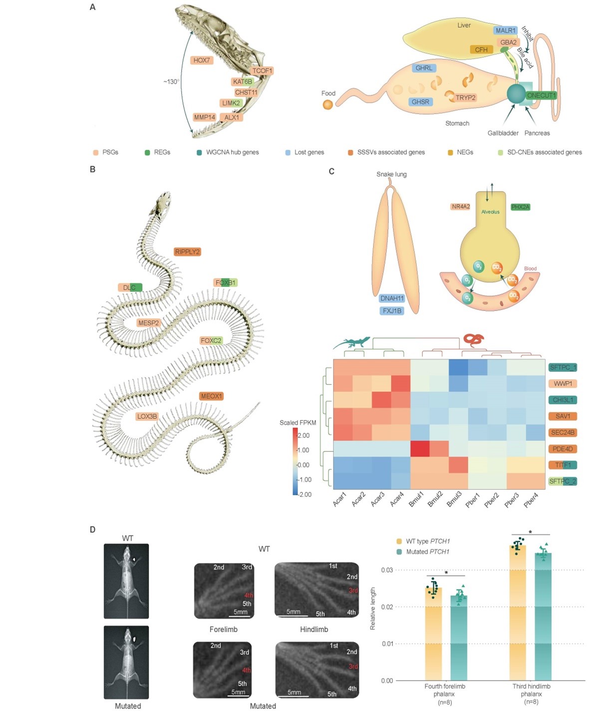 四肢缺失是蛇类最为特殊的特征。该研究揭示除ZRS增强子外,PTCH1基因编码蛋白的三个氨基酸残基缺失,可能是蛇类四肢缺失的重要遗传机制之一。随着四肢缺失,蛇类的体节数增加,身体延长。研究发现控制脊椎前端发育(FOXC2)和后端发育(DLLC)的重要基因受到强烈正选择,提示它们可能是蛇类身体延长的重要遗传基础。蛇类为适应身体延长,部分器官不对称发育,如退化了一侧肺。研究发现蛇类丢失了控制对称发育的DNAH11和FXJ1B基因,这可能是蛇类肺左右不对称发育的关键原因,研究成果对理解脊椎动物的器官不对称发育具有重要意义。