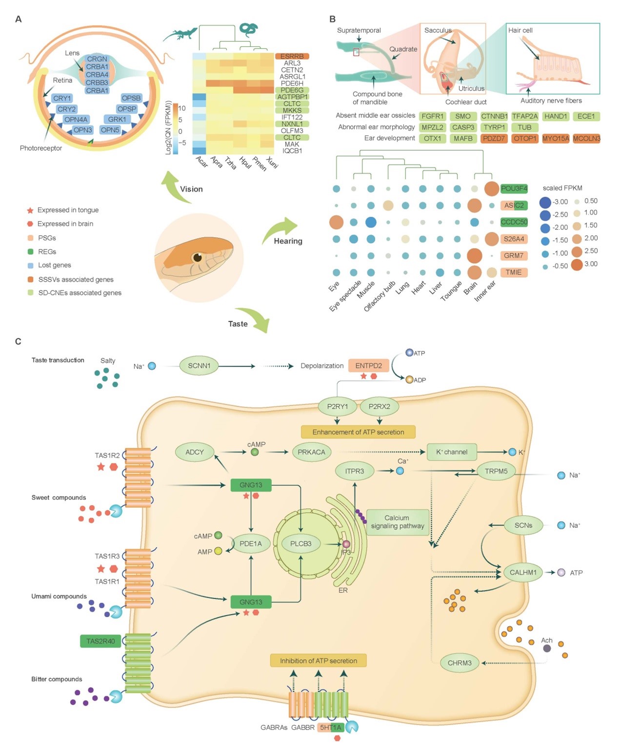 蛇类虽然不是聋子,但没有外耳、中耳,其听力范围仅为50-1,000 Hz,远小于人类(10-20,000Hz)和蜥蜴(<100-7,700 Hz)。研究发现,16个蛇类耳发育相关基因的潜在调控元件发生了快速演化,重要耳蜗蛋白(otospiralin)编码基因在蛇类中丢失,表明它们可能是蛇类耳形态变化的遗传基础。此外,感受机械振动相关的基因(ASIC2)受到强烈正选择,且在蛇类内耳高表达,揭示它可能是蛇类对机械振动敏感的主要原因。尽管蛇类是否有味觉存在争议,该研究发现蛇类普遍拥有味觉受体及味觉传导相关信号通路,且苦味受体编码基因(TAS2R40)快速演化,提示蛇类的味觉可能并未丢失,且功能可能有一定强化。