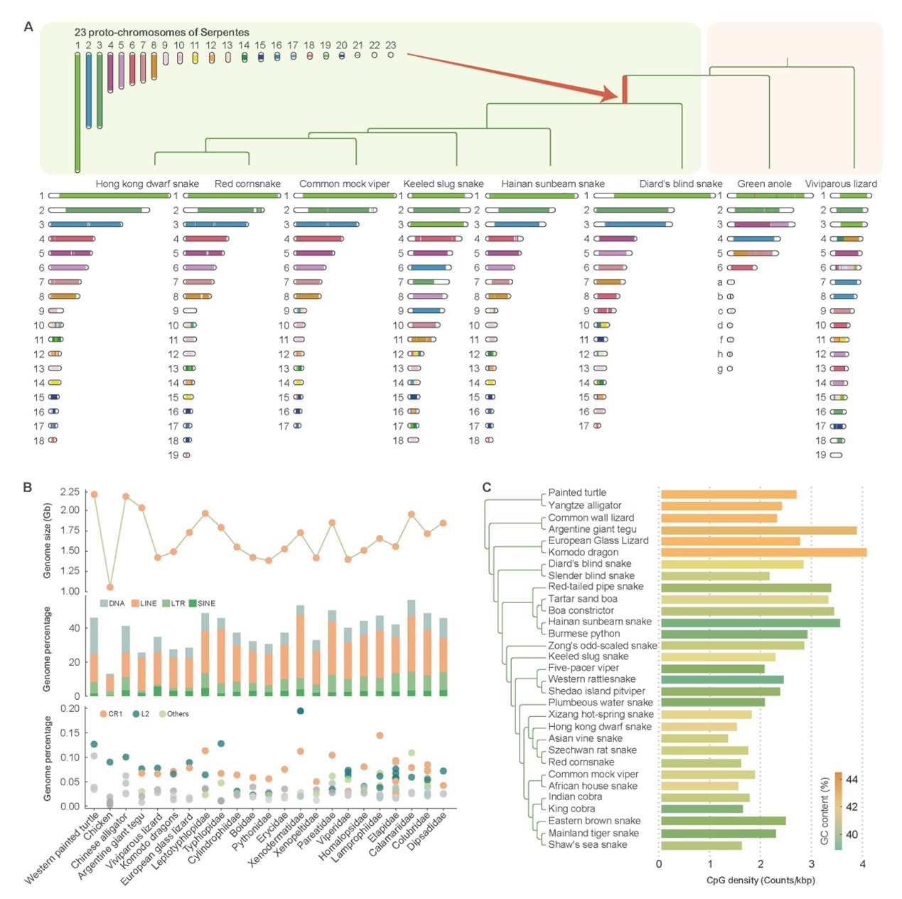 研究重构的蛇类祖先基因组由23对染色体组成,其中包含8对大染色体和15对小染色体。蛇类Z染色体可能起源于蜥蜴的常染色体且在整个蛇类演化中,至少发生过一次断裂。基因组大小与转座子含量的高低呈显著正相关关系,这与蛇类基因组大小与转座子含量无关的结论(之前基于短序列测序提示的结论)是不一致的。与鸟类、哺乳类动物相反,蛇类基因组的GC含量向着降低的方向演化,表明其基因组演化道路可能不同于其它脊椎动物类群。