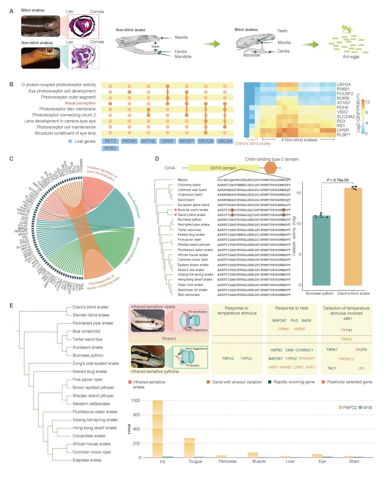 盲蛇类物种是蛇类中高度特化的穴居类群,其头骨高度愈合,眼、牙高度退化,专食蚂蚁及蚂蚁卵。该研究发现与非盲蛇相比,47个编码基因在盲蛇中特异丢失,其中包括8个视觉相关基因。比较转录组分析发现12个视感受相关的基因在盲蛇眼中显著低表达,这些基因组元件的改变可能导致盲蛇类视觉丧失。此外,该研究发现,盲蛇与骨骼及牙齿发育相关编码基因的调控元件快速演化,可能是盲蛇头骨特化及牙齿退化的主要原因。盲蛇适应穴居生活,专食富含几丁质的蚂蚁及蚂蚁卵。研究发现,几丁质酶编码基因受到强烈正选择。酶活性检测实验表明,大盲蛇中该几丁质酶的催化活性显著高于缅甸蟒。这表明盲蛇可通过增强几丁质酶的催化活性,消化蚂蚁及蚂蚁卵中含量颇高的几丁质。