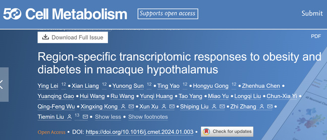 2024年2月6日,复旦大学生命科学学院/代谢与整合生物学研究院刘铁民、孔星星课题组,复旦大学生命科学学院张智课题组与华大生命科学研究院刘石平和徐讯团队合作,在Cell Metabolism 杂志发表了题为Region-specific transcriptomic responses to obesity and diabetes in macaque hypothalamus 的研究论文