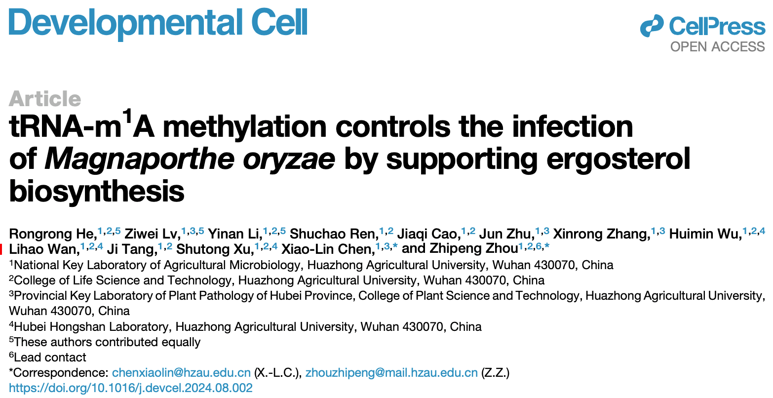 近日,我院陈小林教授课题组与生命科学技术学院周志鹏教授课题组合作在 Cell 子刊《发育细胞》 (Developmental Cell) 发表了题为 “tRNA-m1A Methylation Controls the Infection of Magnaporthe oryzae by Supporting Ergosterol Biosynthesis” 的研究论文
