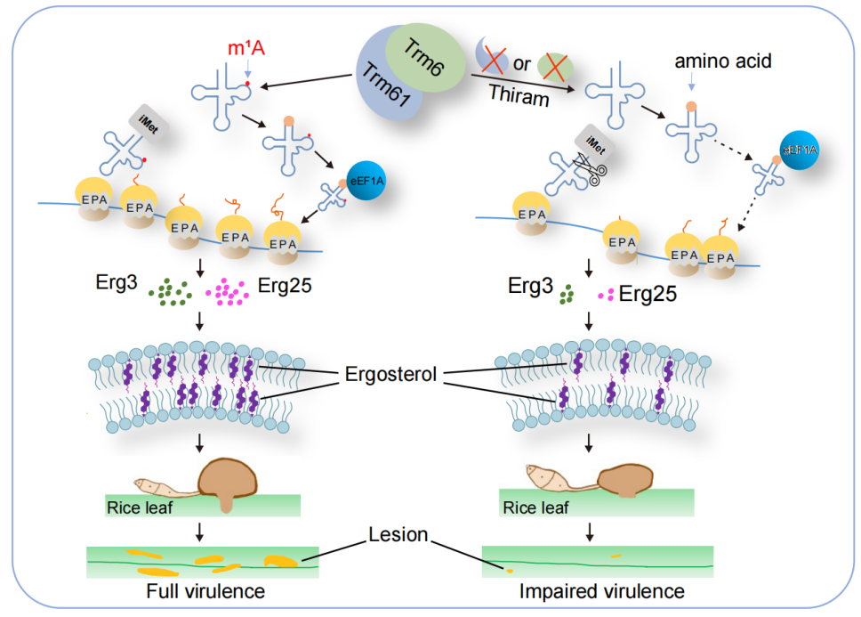 图1. tRNA m1A58修饰调控稻瘟菌致病力的工作模型