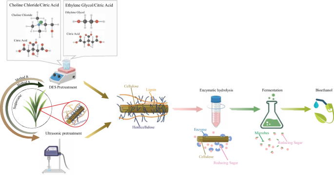 本研究探讨超声与深熔盐溶剂(DES)结合预处理对甘蔗叶成分及产乙醇效率的影响。采用EG/CA和ChCl/CA两种DES体系,通过超声辅助优化预处理参数,显著提升还原糖浓度至8.49 g/L,乙醇产率达17.14%,并验证了FT-IR表征的有效性。