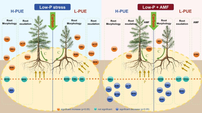 在低磷条件下,高磷利用效率(H-PUE)基因型表现出根长和根表面积增加、根直径减小,以及有机酸分泌和酸性磷酸酶活性增强。低磷条件下接种AMF会抑制H-PUE基因型的根系增殖,同时降低酸性磷酸酶活性和溶解有机碳含量,但增加有机酸浓度和AMF依赖性。相比之下,低磷利用效率(L-PUE)基因型则依赖补偿性的根生物量分配和非特异性的溶解有机碳分泌。主成分分析表明,H-PUE基因型在结构与共生特征(如细根、AMF定植)方面具有协同作用,而L-PUE基因型则通过酸性磷酸酶分泌来激活根际环境。