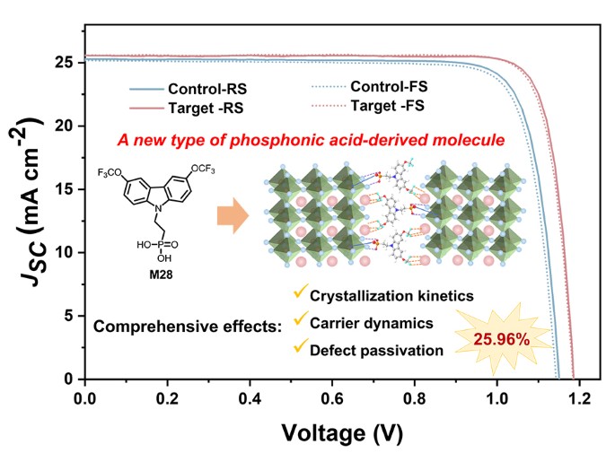通过设计合成新型多功能分子M28并添加至钙钛矿前驱液,可有效改善逆层钙钛矿太阳能电池的薄膜质量和电荷传输,最终实现25.96%的高效转换率和长期稳定性,为功能分子在钙钛矿中的应用提供了新思路。