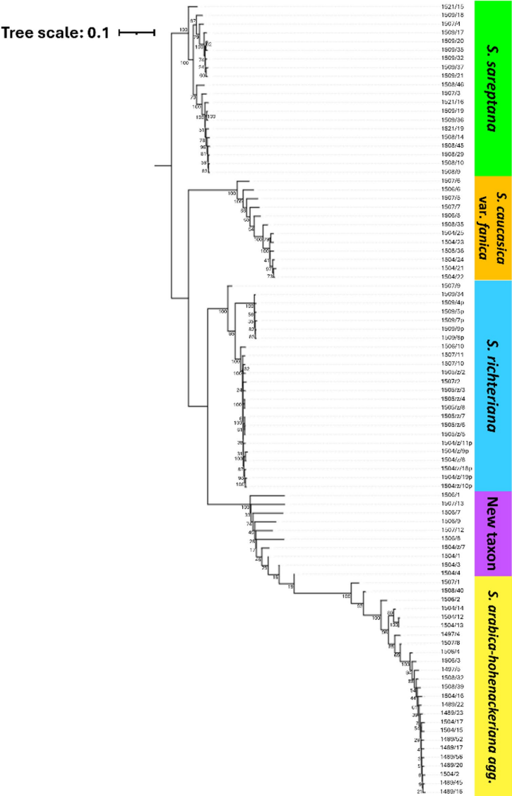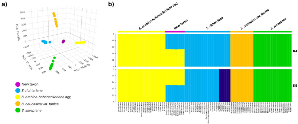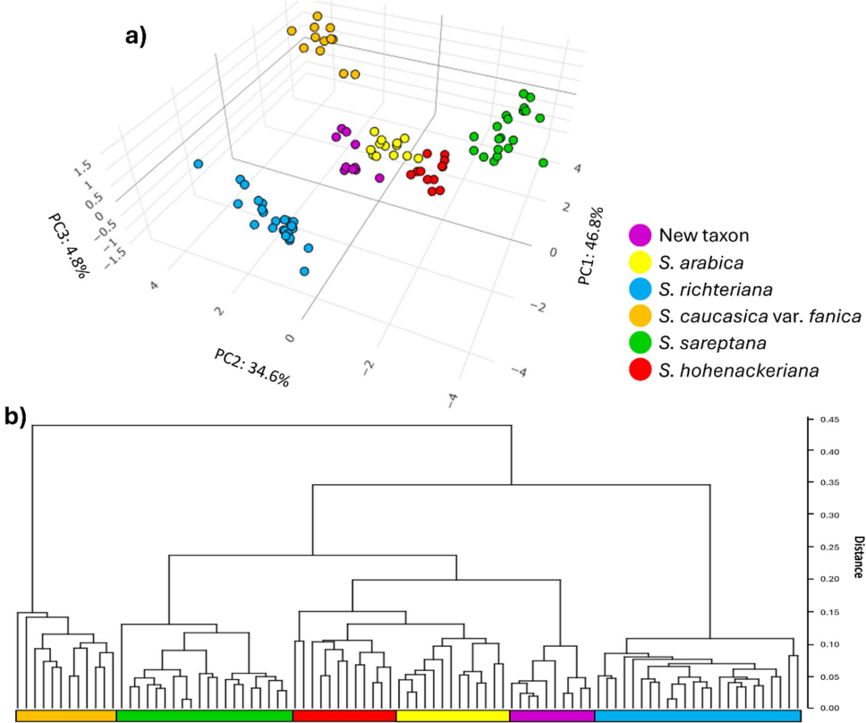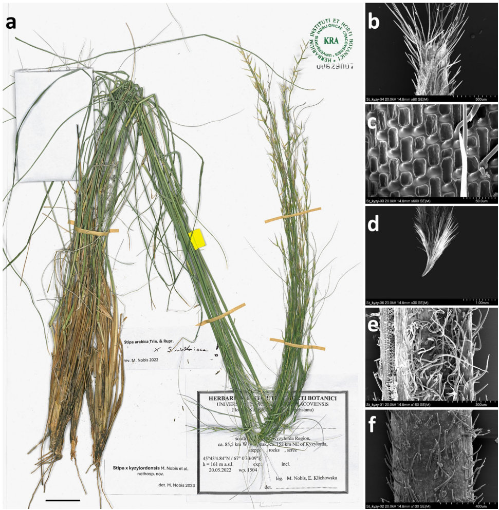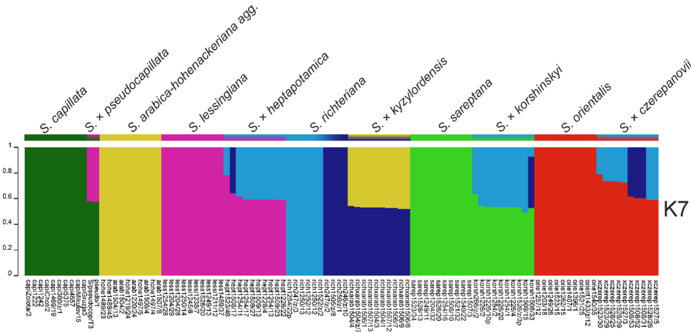 本研究通过整合基因组学与形态学方法,揭示了中亚针茅属(Stipa)植物在自然条件下的种间杂交现象。研究人员针对哈萨克斯坦草原地区形态介于Stipa arabica和S. richteriana之间的疑似杂交个体开展研究,利用SNP分子标记与形态计量分析证实其为F1杂交种,并首次报道了由S. richteriana两种地理基因型参与形成的多个杂交谱系(S. x heptapotamica、S. x czerepanovii等)。该研究为理解禾本科植物远缘杂交机制与物种形成提供了关键证据,对草原生物多样性保护具有重要意义。