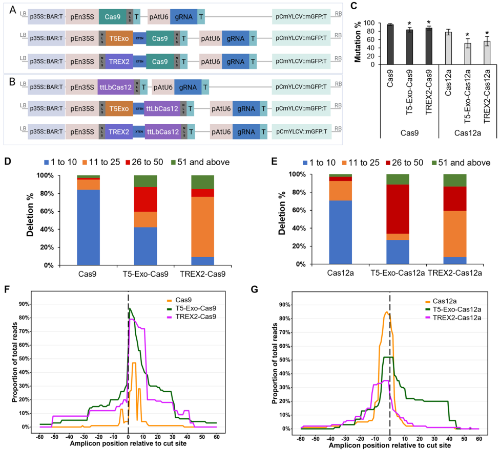 本研究针对CRISPR/Cas系统在大豆基因组编辑中主要产生小片段插入/缺失(indels)的局限性,创新性地将T5外切酶(5'-3'方向)和TREX2外切酶(3'-5'方向)分别与Cas9和Cas12a融合,通过发根农杆菌介导的转化和深度扩增子测序技术,系统评估了这些融合系统在GmWOX5位点的编辑性能。结果表明,外切酶融合显著提高了中等(26-50 bp)和大片段(>50 bp)缺失的频率,并减少了插入事件,为靶向顺式调控元件和microRNA等功能基因组学研究提供了高效工具。