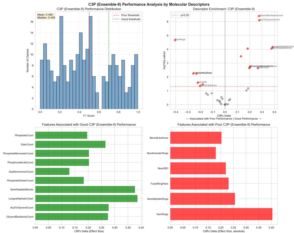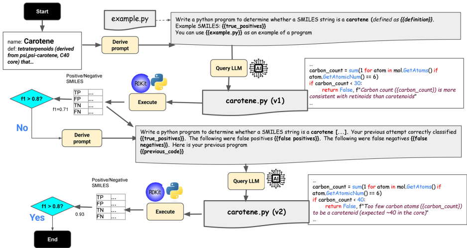 本研究针对化学结构分类中人工方法效率低下与现有自动化方法可解释性不足的问题,开发了一种利用生成式AI自动编写化学分类程序的新方法。研究人员通过Learn-Execute-Iterate-Adapt(LEIA)流程,成功为ChEBI数据库中的化学类别生成了可执行的Python分类程序,构建了ChEBI化学类别程序本体(C3PO)。实验表明C3PO在保持可解释性的同时,性能优于基于SMARTS的简单分类器,虽略低于最先进的深度学习模型,但提供了互补优势。该方法为化学数据库 curation 提供了可解释的自动化工具,显著提升了分类效率和透明度。