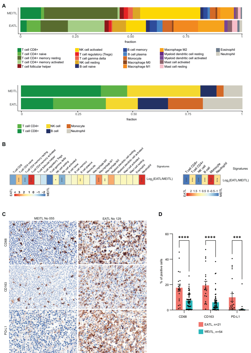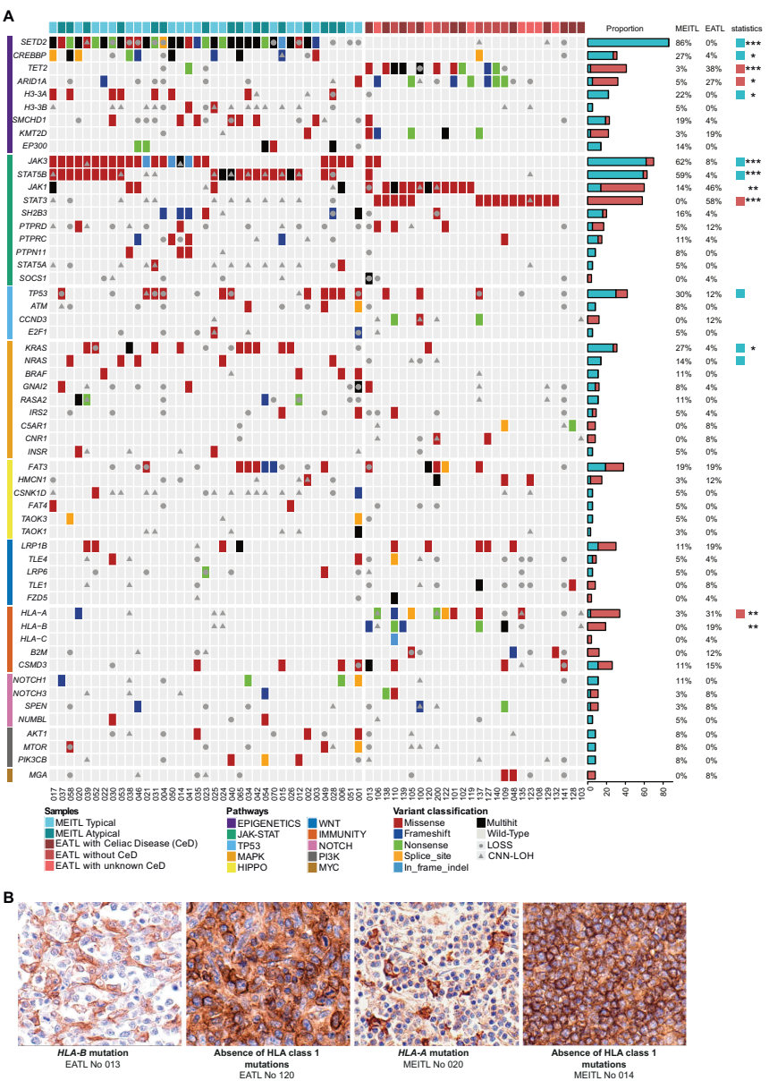 本研究针对肠病相关性T细胞淋巴瘤(EATL)和单形性亲上皮性肠道T细胞淋巴瘤(MEITL)的分子特征差异,通过全外显子测序、RNA测序和DNA甲基化分析,揭示了二者在表观遗传调控(SETD2、H3-3A/B)、JAK-STAT通路(STAT5B/JAK3 vs STAT3/JAK1)和免疫微环境(HLA-I缺失、巨噬细胞浸润)的特异性改变,为精准诊断和靶向治疗提供重要依据。