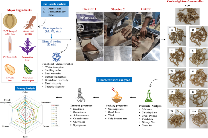 由于人们对麸质相关疾病的认识不断提高以及识别方法的改进,麸质相关疾病的发病率有所增加,这促使无麸质(GF)市场实现了显著增长。在这项研究中,研究人员通过使用不同的原料(如经过热湿处理的稗米粉、树胶、葛根粉以及车前籽壳、苋菜粉和燕麦粉的不同组合),采用压制和切割技术制备了多种无麸质面条(T1至T10)。对所使用的无麸质原料的粒径分析显示,这些粒径差异显著影响了面条的烹饪性能;而颜色分析表明,制备出的面条颜色比对照组更深。随着车前籽壳添加量的增加(尤其是10%时),面条的吸水率和峰值粘度也有所上升。配方T9的粗蛋白含量(9.18%)、粗脂肪含量(6.69%)、总灰分含量(2.42%)和粗纤维含量(12.64%)均较高,其整体接受度得分也为8分。该研究证明,利用压制和切割设备可以生产出品质更好的稗米无麸质面条,并且具有更好的感官接受度。此外,这项研究还突显了使用稗米生产无麸质面条的创新性,这与以往主要依赖大米或淀粉基配方进行冷压加工的研究有所不同。
