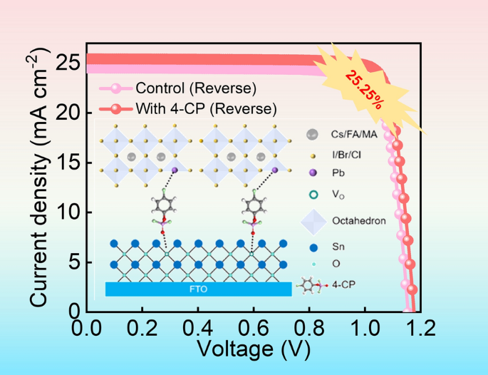 钙钛矿太阳能电池通过引入4-氯苯基二氯磷酸实现多功能界面工程,有效钝化SnO?氧空位、调控晶粒生长并固定铅离子,使器件效率达25.25%,铅泄漏降低89%至30 ppb以下,并保持92%初始效率通过1000小时湿热老化测试。