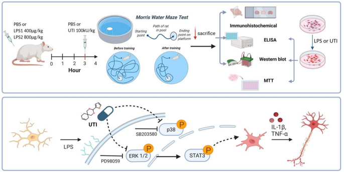 图形摘要展示了实验设计和关键发现。在体内研究中,大鼠接受腹腔注射PBS或LPS,3小时后给予UTI。UTI注射1小时后,通过Morris水迷宫评估认知功能,并采集海马组织进行免疫组化、ELISA和Western blot分析。在体外模型中,BV2小胶质细胞先接受LPS处理,随后进行MTT测定、ELISA和Western blot实验。结果表明,UTI可以改善大鼠的记忆和认知功能,并通过MAPK和JAK-STAT信号通路抑制活化的小胶质细胞产生的炎症细胞因子。