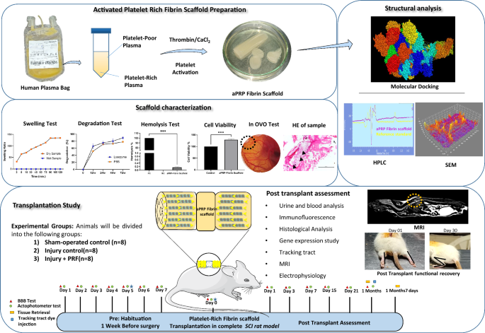 PRP-纤维蛋白支架由供体血浆合成,并对其物理化学性质、降解特性、蛋白质释放动态和细胞相容性进行了广泛表征。其再生潜力通过一系列综合评估方法进行验证,包括体外绒毛尿囊膜(CAM)实验、完整的脊髓横断大鼠模型以及多种评估指标,如磁共振成像(MRI)、逆行神经纤维追踪、电生理记录和基因表达分析。