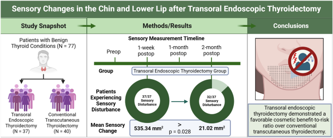 本研究比较经口内镜甲状腺切除术与传统手术对感觉神经的影响。纳入77例患者,其中37例接受经口手术,40例接受传统手术。经口组术后立即出现感觉障碍,但1周和2个月后改善,5例完全恢复。传统组无感觉变化。经口手术在美容和安全性上更优。