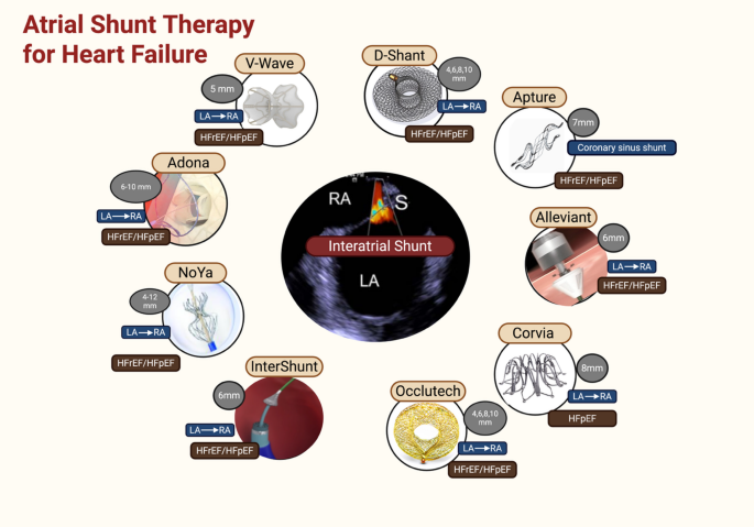 了解房间隔分流的主要发现:LA:左心房;RA:右心房;HFpEF:射血分数保留的心力衰竭;HFrEF:射血分数降低的心力衰竭;插图使用BioRender制作。