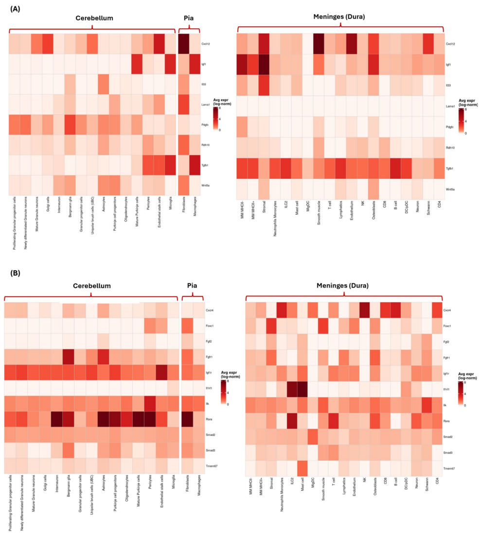 本综述聚焦于脑膜-小脑轴这一新兴概念,系统阐述了脑膜作为关键外部信号源,通过释放细胞因子(如CXCL12、IL-33)、趋化因子、生长因子(如FGF2、IGF-1、TGF-β)和视黄酸等,在调控小脑颗粒细胞前体(GCPs)增殖、浦肯野细胞(PCs)成熟、放射状胶质细胞排列及突触修剪等关键发育过程中的重要作用。文章整合了多种基因工程小鼠模型(如CXCR4-/-、Foxc1-/-)的体内研究证据,揭示了脑膜信号失调与小脑结构异常及神经发育障碍(如自闭症谱系障碍ASD)的潜在关联,为理解小脑发育及相关疾病病因提供了全新视角。