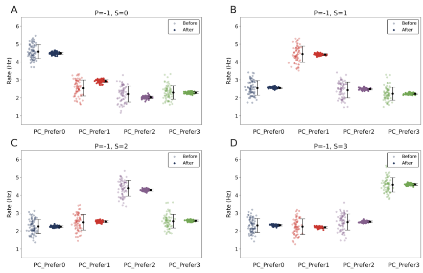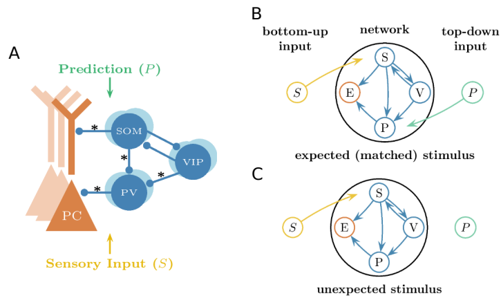 本文推荐:为揭示预期抑制(ES)的神经环路机制,研究人员构建了包含兴奋性锥体细胞(PCs)和三种抑制性中间神经元(PV、SOM、VIP)的计算模型。研究发现SOM神经元通过特征特异性树突抑制介导预期刺激下的选择性抑制,而VIP神经元通过抑制PV神经元实现去抑制,增强对意外刺激的反应。该研究阐明了抑制性神经元多样性、突触可塑性和特征选择性在预测性编码中的协同作用。