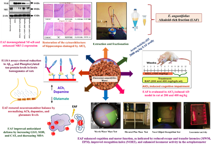 示意图总结了Elaeocarpus angustifolius富含生物碱的提取物(EAF)在AlCl?诱导的AD大鼠模型中的神经保护作用机制