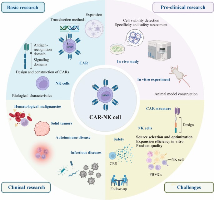 CAR-NK细胞在治疗血液系统恶性肿瘤、实体瘤、自身免疫性疾病和传染病方面表现出良好的安全性和初步疗效。然而,其在体内的持久性和对实体瘤微环境的适应性仍存在挑战。随着基因工程的持续优化、联合疗法和个人化策略的应用,CAR-NK疗法有望成为下一代免疫疗法的重要支柱,并推动精准医学的发展。