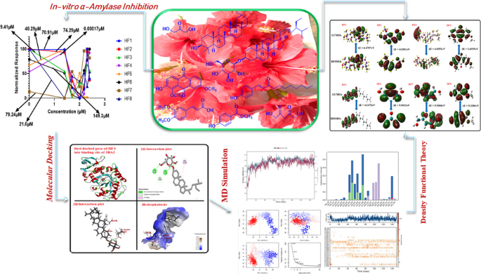本研究从 Hibiscus rosa-sinensis 花中分离出8种化合物,其中β-羟基-1,7-二甲氧基蒽醌苷(HF3)经体外及分子模拟验证,对α-淀粉酶抑制效果最佳(IC50=9.41 μM,MolDock评分-130.179 kcal/mol),且其与酶复合物稳定性优于标准药物阿卡波糖。