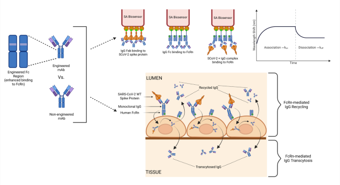 研究分析抗原结合对FcRn介导的转运与再生影响,比较Sotrovimab(Fc工程化抗体)与B38(非工程化对照)在病毒spike蛋白存在下的运输效率(均下降,Sotrovimab降幅46.7% vs B38 23%)及再生变化(Sotrovimab微降,B38显著增加),揭示抗体高亲和力源于中性pH下解离降低,而B38在pH6.0结合更快,提示需根据抗原负荷调整剂量策略以优化疗效。