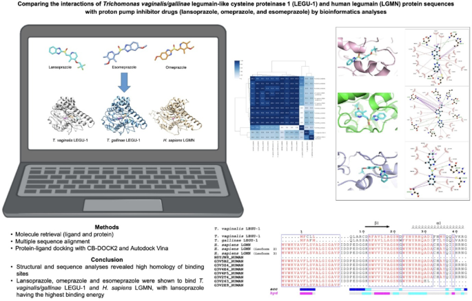 通过生物信息学分析,比较阴道毛滴虫/鸡Legumain样半胱氨酸蛋白酶1(LEGU-1)与人类Legumain(LGMN)蛋白序列与质子泵抑制剂药物(兰索拉唑、奥美拉唑和埃索美拉唑)之间的相互作用