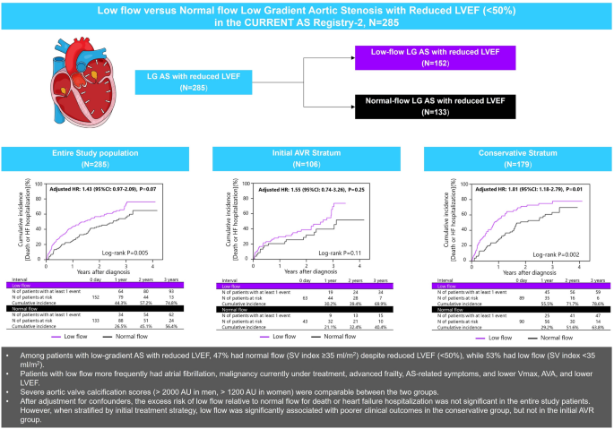 CURRENT AS Registry-2中LVEF降低(<50%)的低流量与正常流量低梯度AS的对比。缩写与图1和图2中的相同