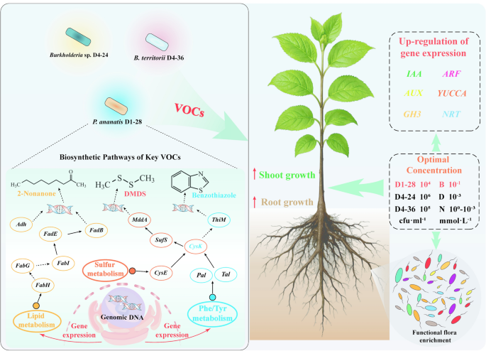 挥发性有机物(VOCs)从三种PGPR菌株中按剂量效应影响苹果生长,最佳浓度分别为10^4、10^6、10^5 CFU·mL?1,D1-28效果最强,促进株高75%、生物量200%、根体积276%。机制涉及D(10^-1~10^-3 mmol·L?1)、B(10^-3 mmol·L?1)窄窗效应及N(1~10^-3 mmol·L?1)广谱效应,上调生长相关基因并重塑根际微生物群落,基因组测序揭示VOCs合成基因网络。"剂量-基因-微生物群"模型为工程化生物接种剂开发提供靶点。