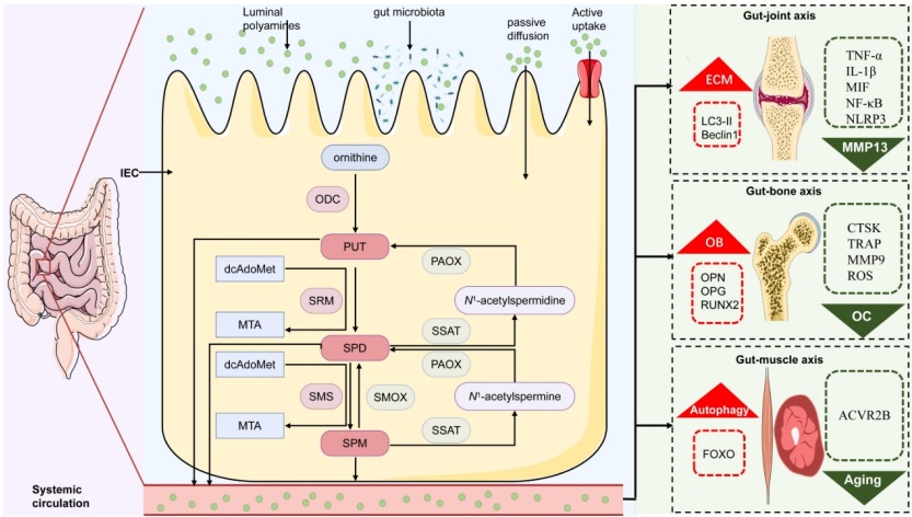本综述系统阐述了多胺(Polyamines)在骨质疏松(Osteoporosis)、骨关节炎(Osteoarthritis)及少肌症(Sarcopenia)等年龄相关性骨病中的核心作用机制,揭示了其通过调控肠道-骨轴/关节轴、免疫微环境、氧化应激及自噬(Autophagy)等通路发挥骨保护效应的新视角,为靶向多胺代谢(如ODC、SSAT等关键酶)的疗法提供了重要理论依据。
