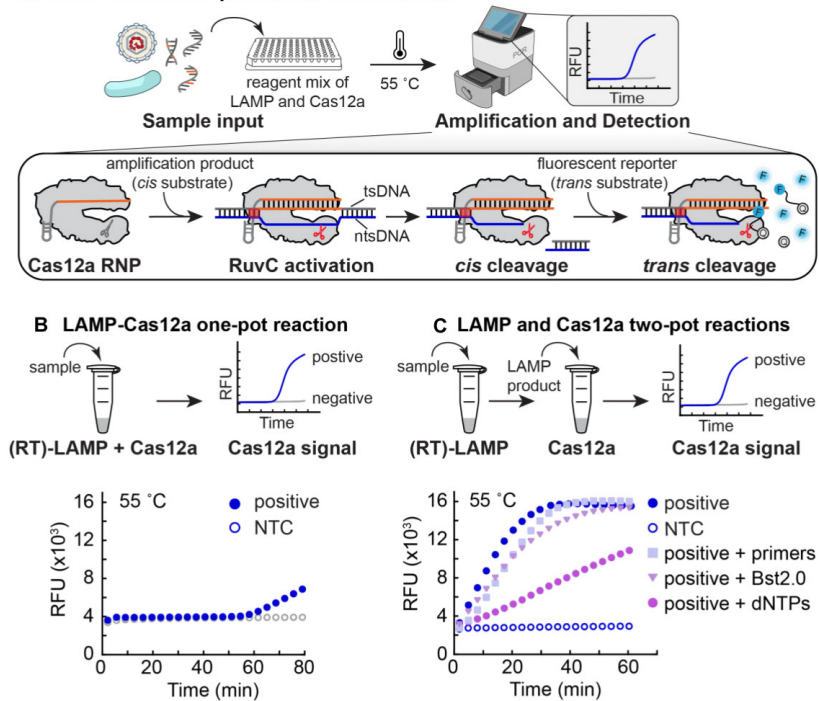 在分子诊断领域,CRISPR-Cas系统与等温扩增技术的结合正引发革命性变革。Cas12a因其独特的"顺式-反式"双核酸酶活性备受关注:特异性识别靶DNA(顺式活性)后,可非特异性切割周围核酸(反式活性)。这种特性使其成为理想的检测工具——顺式活性确保特异性,反式活性提供灵敏信号输出。然而现有技术面临关键瓶颈:常用中温型Cas12a(如LbaCas12a)无法耐受环介导等温扩增(LAMP)所需的55-65°C高温,迫使检测采用"双管"流程,既增加操作复杂度又易导致交叉污染。