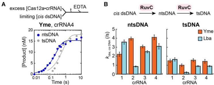 动力学解析部分获得突破性发现。如图2所示,单周转实验显示YmeCas12a的顺式切割速率(kobs,cis