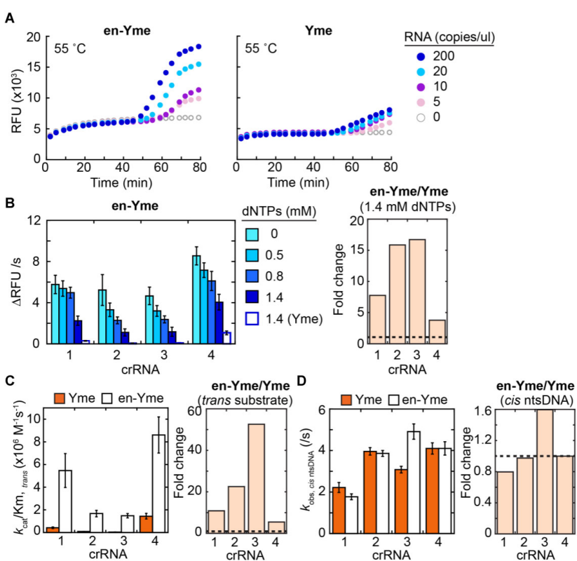 降低2倍,且不影响顺式活性。通过局部结构比对,团队进一步在RuvC和Nuc域引入正电荷残基(G1019K/I1155R),并结合DNA结合蛋白(Sso7d/ET-SSB)融合策略,使最优变体en-Yme的检测灵敏度提升至5拷贝/μL。