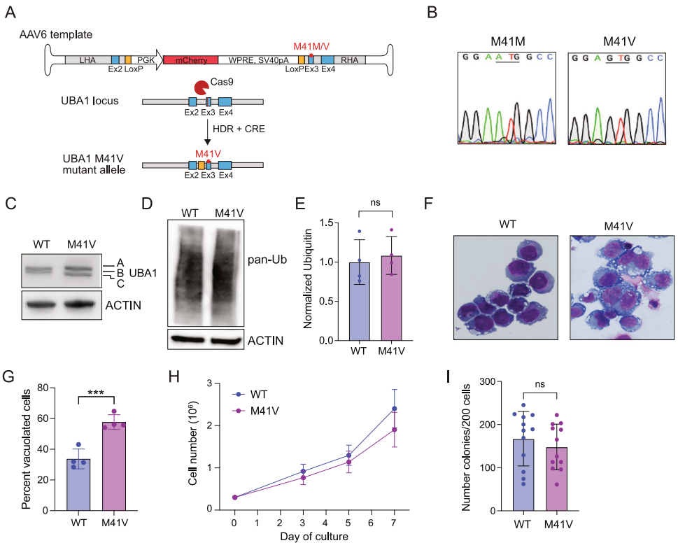 通过精确编辑UBA1基因引入M41V突变,证实突变细胞呈现典型病理特征:
