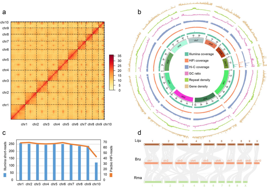 为填补这一空白,中国科学院昆明动物研究所联合云南省农业科学院的研究团队,采用多组学技术首次构建了芒果天牛染色体水平基因组。研究采集自云南保山芒果园的样本,通过PacBio Revio平台生成21 Gb HiFi数据(Q20以上质量),结合61 Gb Hi-C数据和89 Gb Illumina短读长数据,使用hifiasm和3D-DNA流程完成组装。最终获得338.08 Mb基因组(与k-mer估计的325.90 Mb接近),包含10条假染色体(99.77%序列锚定),其中chr10通过共线性分析和测序深度验证为X染色体。