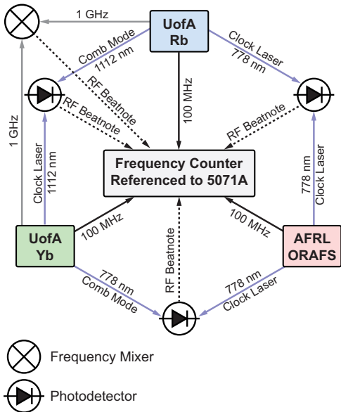 关键技术方法包括:1)基于174Yb原子1S0→3P1跃迁的调制转移光谱钟,采用1112nm光纤激光倍频产生556nm探测光;2)87Rb原子5S1/2→5D5/2双光子跃迁钟,使用1552nm/1560nm双色激光激发;3)光学铷原子频率标准(ORAFS)采用单激光778nm激发方案。所有系统均集成自参考光学频率梳,可将光学稳定度传递至100MHz/1GHz电信号输出。通过三边帽法(three-cornered hat)分析技术,在舰载振动(±5m/s2)、温度波动(10K/小时)等恶劣条件下仍能准确评估各时钟性能。