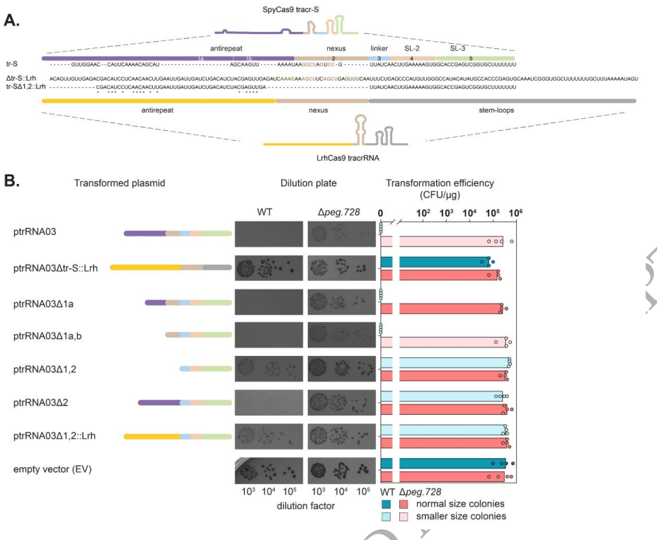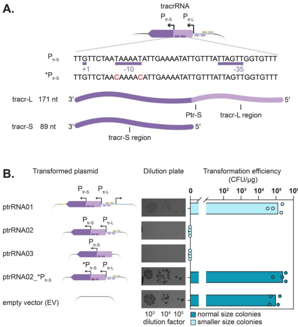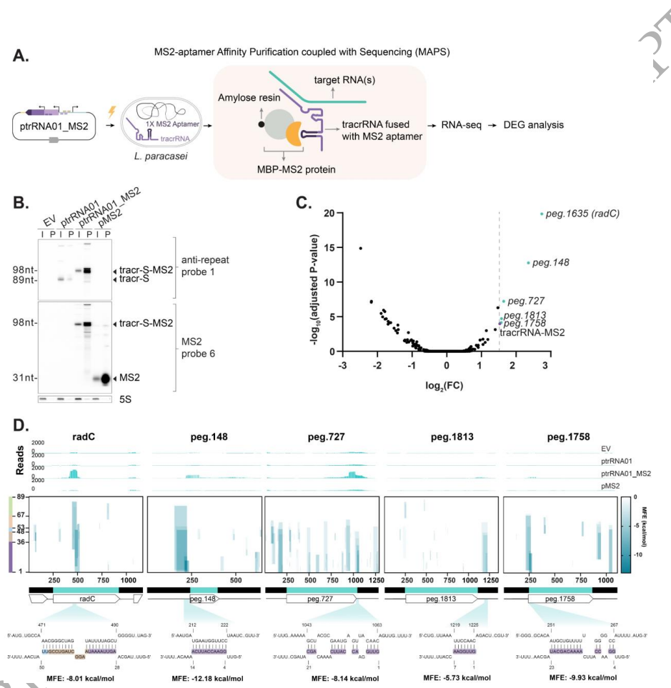 研究人员主要采用了以下关键技术方法:1) 质粒构建与细菌转化,通过系列质粒设计解析毒性元件;2) Northern blot分析tracrRNA亚型表达;3) MS2亲和纯化偶联RNA测序(MAPS)鉴定tracrRNA相互作用靶标;4) 全基因组测序分析逃逸突变体;5) IntaRNA预测RNA-RNA相互作用。使用的乳酸菌样本包括L. paracasei B株及ATCC标准菌株。