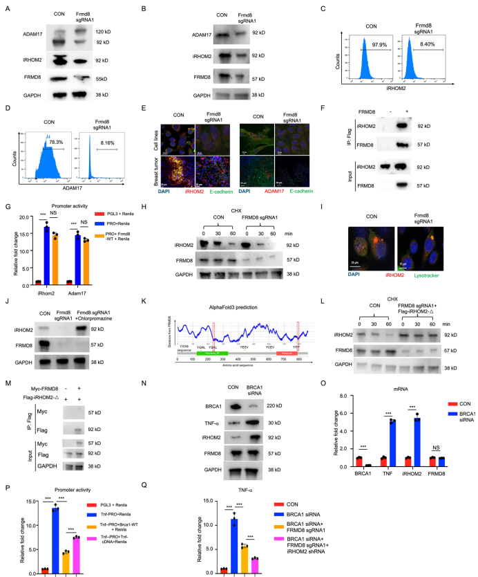 FRMD8结合iRHOM2的YXX229/790内吞基序,阻断溶酶体降解路径。敲除FRMD8后,iRHOM2与溶酶体共定位增加2倍(p<0.01),ADAM17成熟受阻,tmTNF-α切割减少。BRCA1缺失虽增加TNF-α转录,但FRMD8low进一步放大tmTNF-α膜表达。