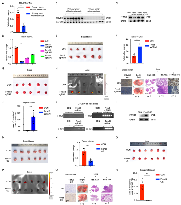 FRMD8敲除细胞(sgRNA1)原位移植后,原发性肿瘤体积增大2.3倍(p<0.001),肺、肝、脑转移增强。反之,过表达FRMD8的转移性细胞系642转移减少50%。循环肿瘤细胞(CTCs)检测显示,FRMD8low促进肿瘤细胞早期血行播散。