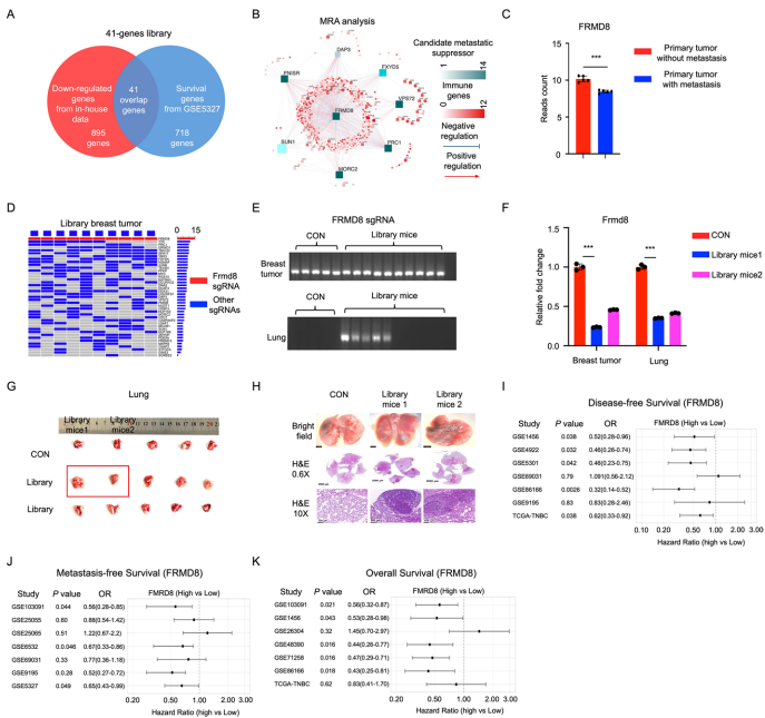临床样本RNA测序与公共数据集交叉鉴定41个转移相关基因。CRISPR文库筛选发现,Frmd8 sgRNA在转移灶富集,其低表达显著缩短患者无转移生存期(MFS)(GSE5327等7个数据集)。小鼠模型中,FRMD8low的759细胞肺转移增加4倍(p<0.001)。