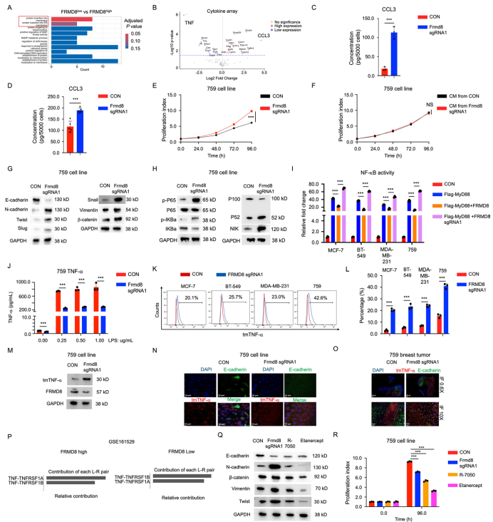 FRMD8low细胞表面tmTNF-α升高3倍(p<0.001),sTNF-α分泌减少,激活NF-κB通路并上调间质标志物(N-cadherin、Vimentin)。单细胞数据(GSE161529)证实FRMD8low肿瘤中TNF-TNFRSF1B(TNFR2)信号增强,而TNFR1/2双阻断剂依那西普可逆转EMT表型。