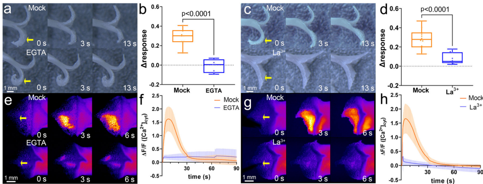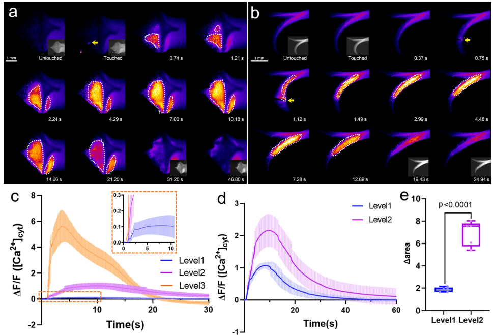 机械刺激诱导[Ca2+]cyt从刺激位点向柱头-花柱连接处传播,信号强度与刺激等级正相关(L1-L3),且早于物理运动(图2a-b):